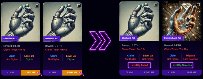 Leveling up is influenced by a transparent, on-chain calculation system that introduces an element of variability while maintaining fairness and decentralization. The probability of a successful upgrade ranges from 80% to 30%, with slight adjustments in each season’s game mechanics.