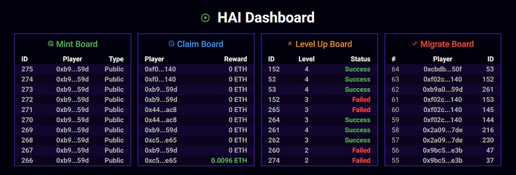 Players can now monitor real-time in-game activities, including the latest mints, claims, level-ups, and migrations. With the HAI Dashboard, players can develop strategic decisions based on observing in-game trends and competition movements.