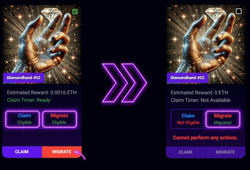 Migrate Each season, HandsNFT AI will allow a limited number of DiamondHand Cards to be migrated. Through migration, players can burn a DiamondHand Card to receive an exclusive NFT from the HandsNFT AI NFT collection on the Ethereum blockchain. These NFTs will be distributed transparently through an on-chain process after the season ends.